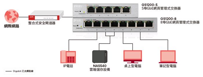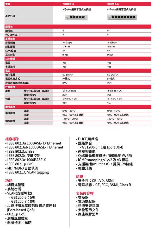 合勤科技GS1200系列GbE網頁管理型交換器,提供網頁管理介面(Web GUI),可輕鬆管理QoS、IGMP snooping設定,符合大多用戶基本需求,是小型企業網路建置的首選。