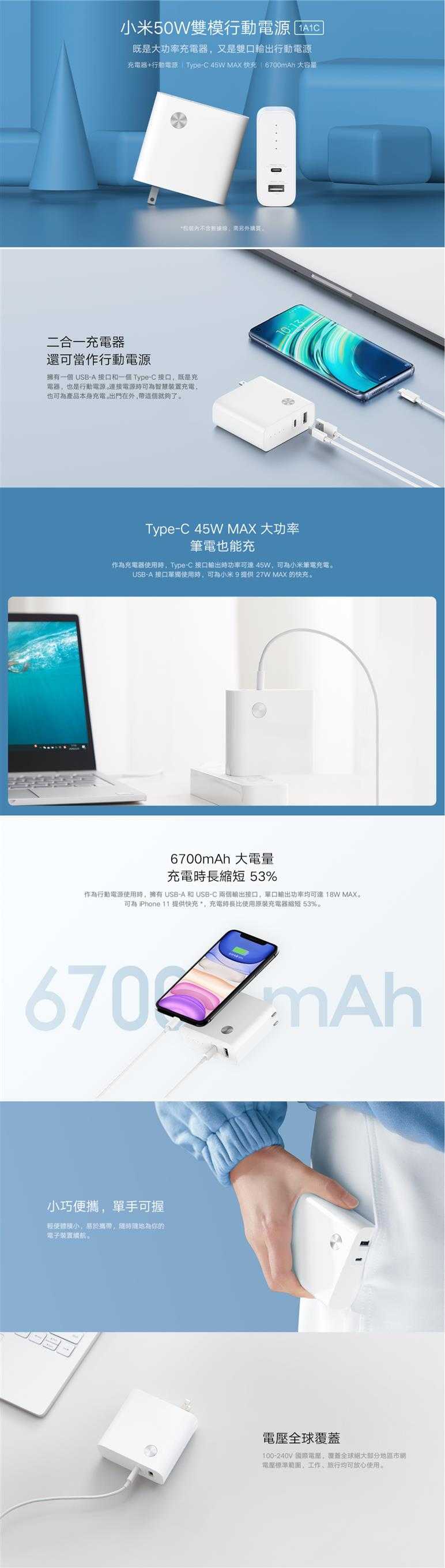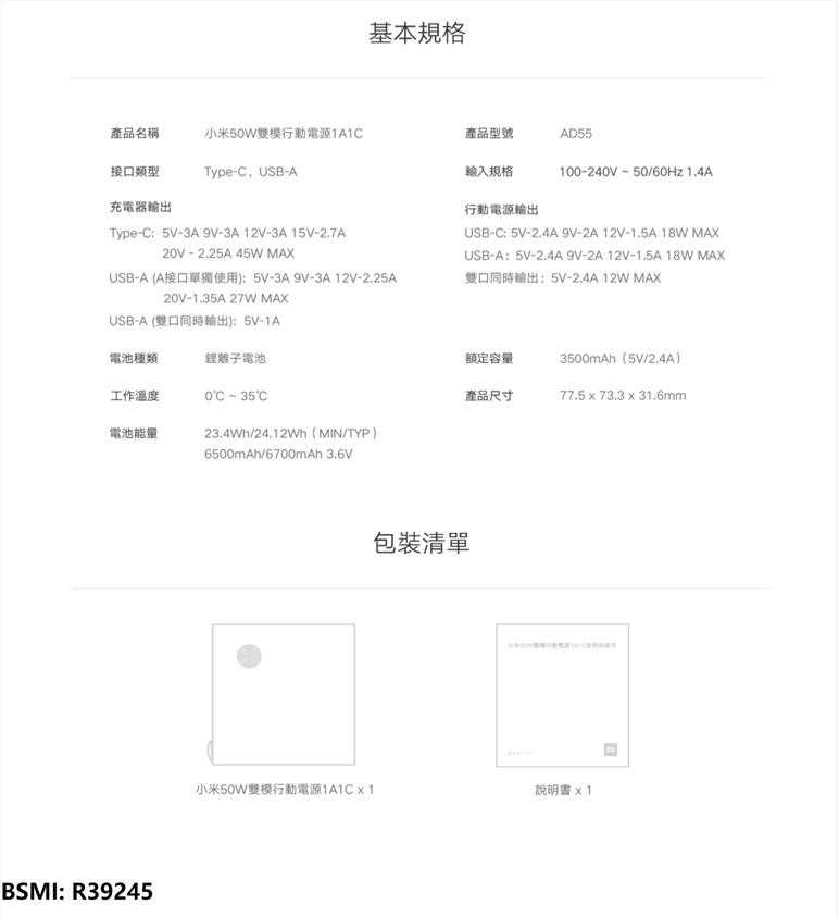 ◎產品名稱:小米 50W雙模行動電源 1A1C