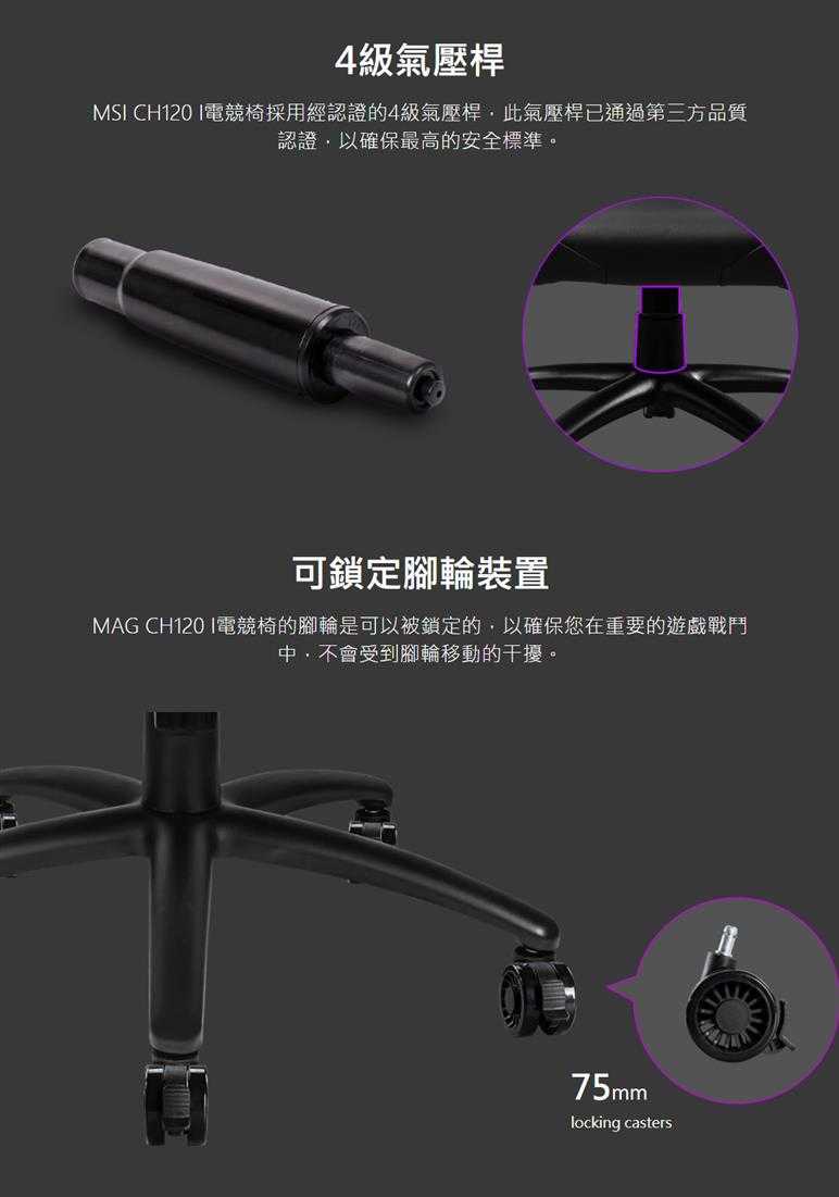 MSI CH120 I電競椅採用經認證的4級氣壓桿,此氣壓桿已通過第三方品質認證,以確保最高的安全標準。