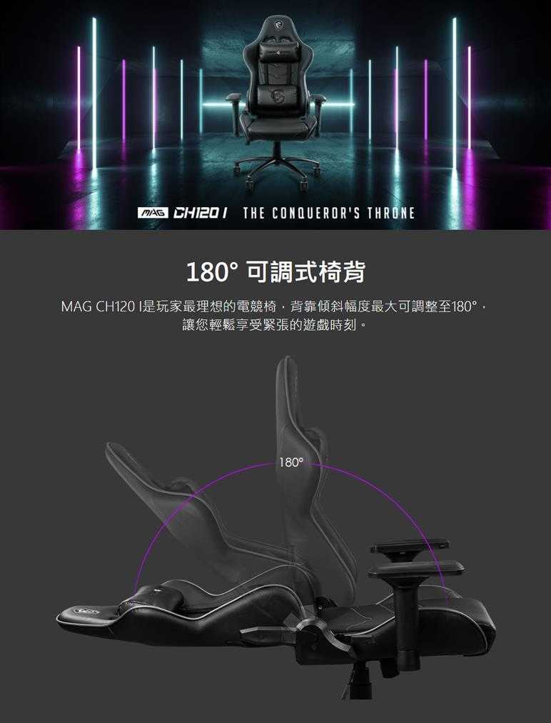 MAG CH120 I是玩家最理想的電競椅,背靠傾斜幅度最大可調整至180°,讓您輕鬆享受緊張的遊戲時刻。