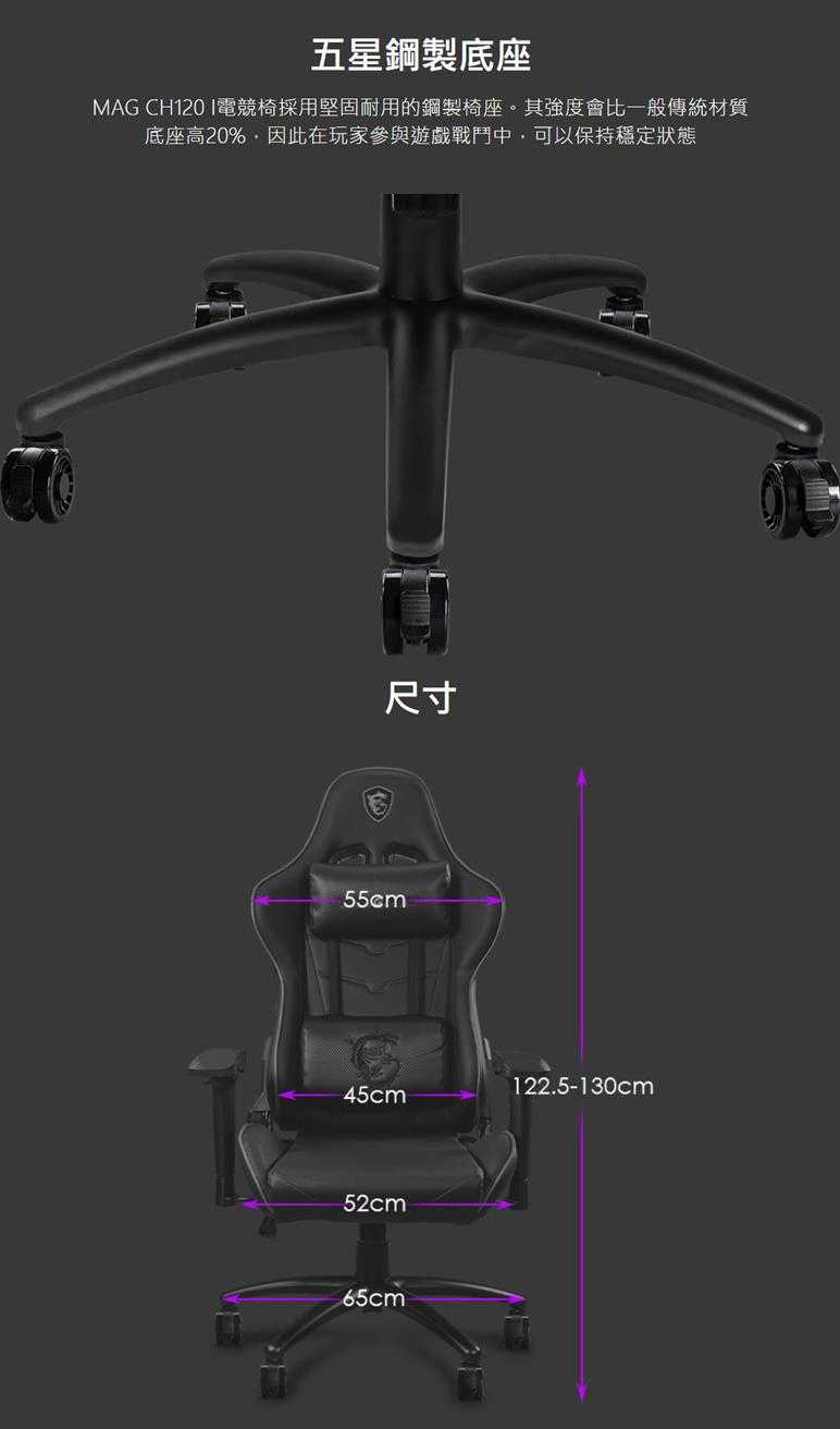 MAG CH120 I電競椅採用堅固耐用的鋼製椅座。其強度會比一般傳統材質底座高20%,因此在玩家參與遊戲戰鬥中,可以保持穩定狀態。