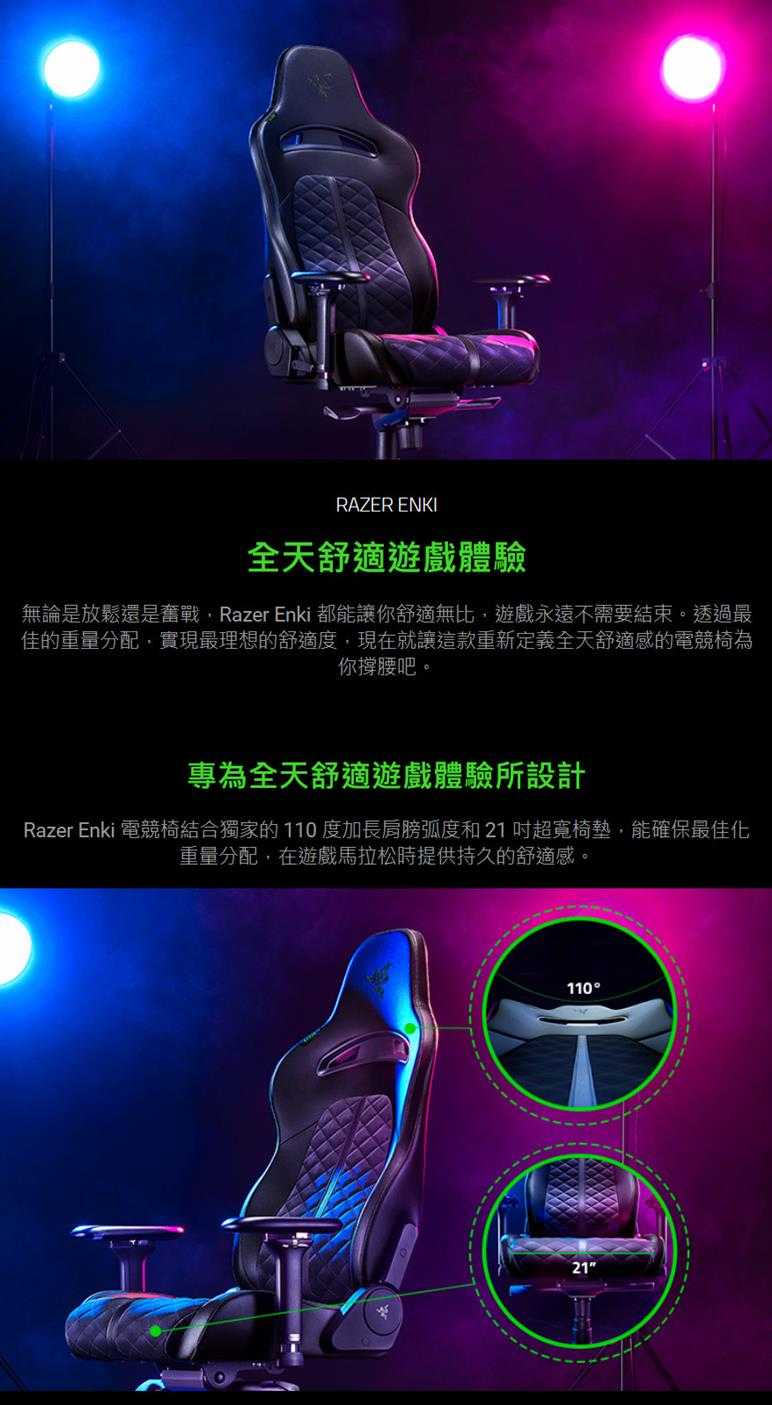 Razer Enki 電競椅結合獨家的 110 度加長肩膀弧度和 21 吋超寬椅墊,能確保最佳化重量分配,在遊戲馬拉松時提供持久的舒適感。
