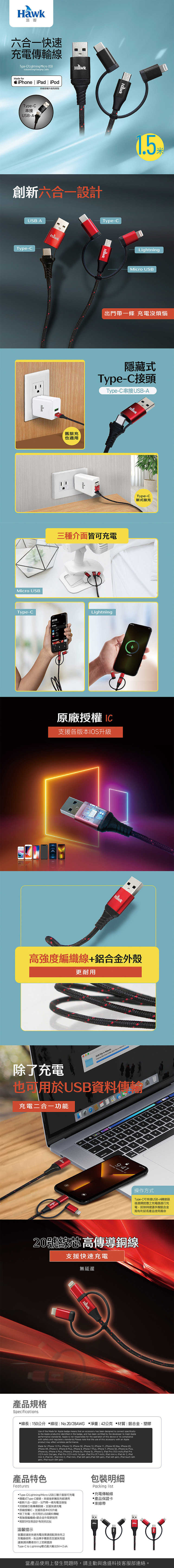 Hawk逸盛 Type-C六合一快速充電傳輸線1.5M MFI 紅原價 599 【現省 130】