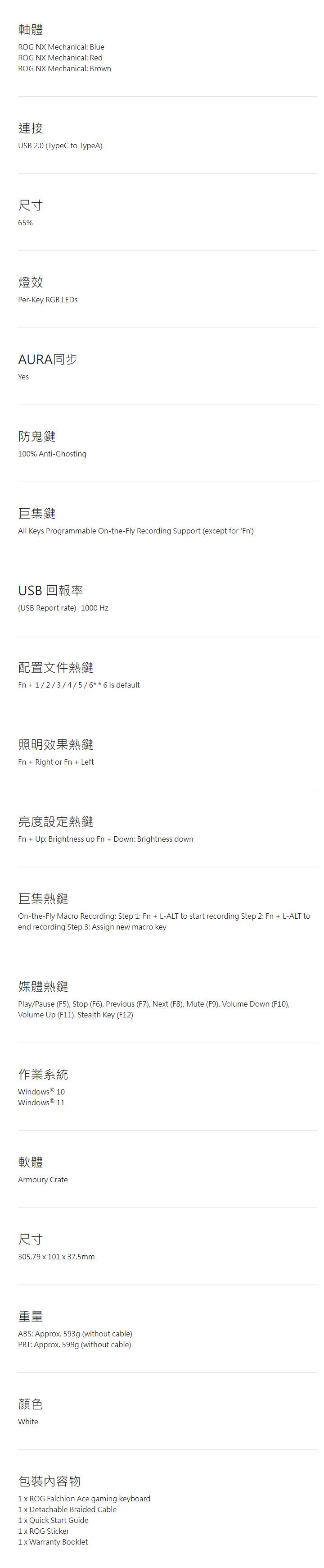 ASUS 華碩 ROG Falchion Ace NX 機械電競鍵盤 白 青軸 {{specImage.SkuName}}