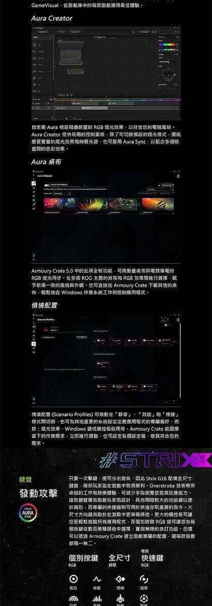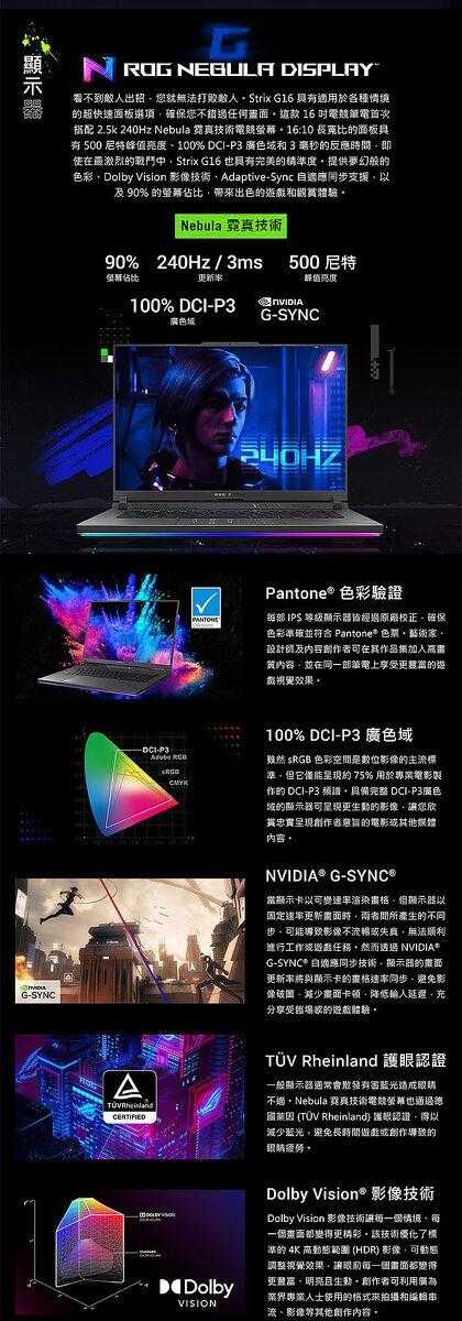●螢幕尺寸:16 "(薄邊框)/QHD+ 16:10 (2560 x 1600, WQXGA)/240Hz/3ms/IPS-level/Anti-glare/DCI-P3 100%/Pantone 認證/Dolby Vision/G-Sync
