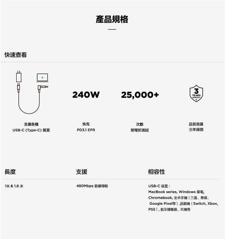 - 耐用設計|通過 25000+ 耐彎折、10000+ 插拔測試認證