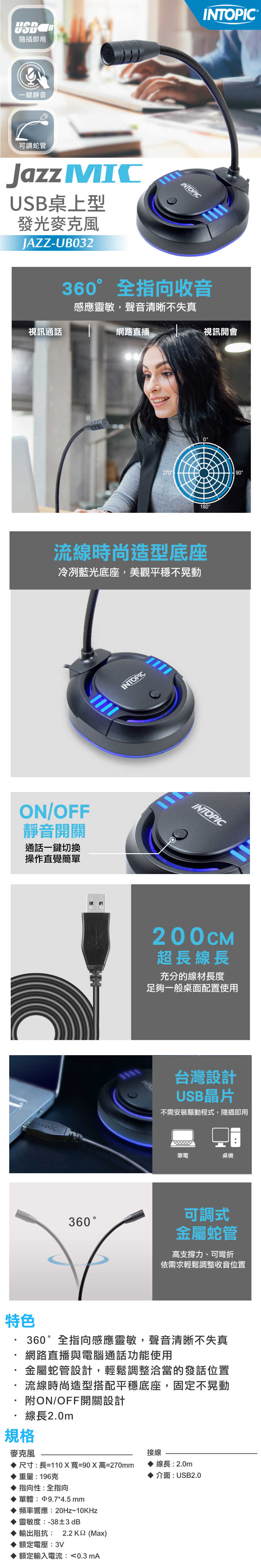 - 尺寸 : 麥克風 :L=110mm W=90mm H=270mm