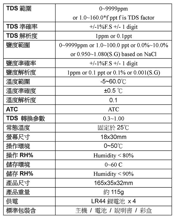 產品皆為【CE認可】並符合【ISO9001 & ISO13485】之規範,體積輕小價格實惠,同步雙數據顯示鹽度+溫度或TDS+溫度,IP65 防水外殼,適合居家水質檢測、戶外登山露營飲用水檢測、農業灌溉用水鹽度檢測,居家飲用水TDS標準,參考106年法規每公升應小於500ppm。