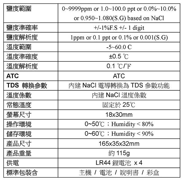 產品皆為【CE認可】並符合【ISO9001 & ISO13485】之規範,體積輕小價格實惠,同步雙數據顯示鹽度+溫度,IP65 防水外殼,適合居家水質檢測、戶外登山露營飲用水檢測、農業灌溉用水鹽度檢測。