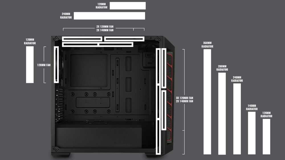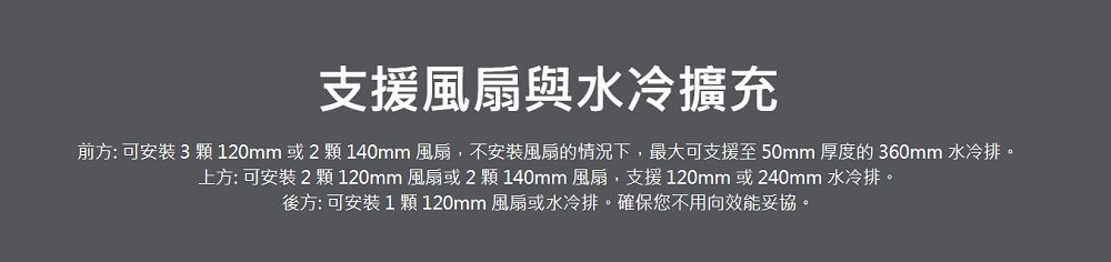 前方: 120 / 140 / 240 / 280 / 360mm 水冷排 (厚度 75mm) 上方: 120 / 240mm 後方: 120mm |