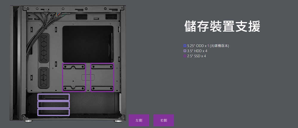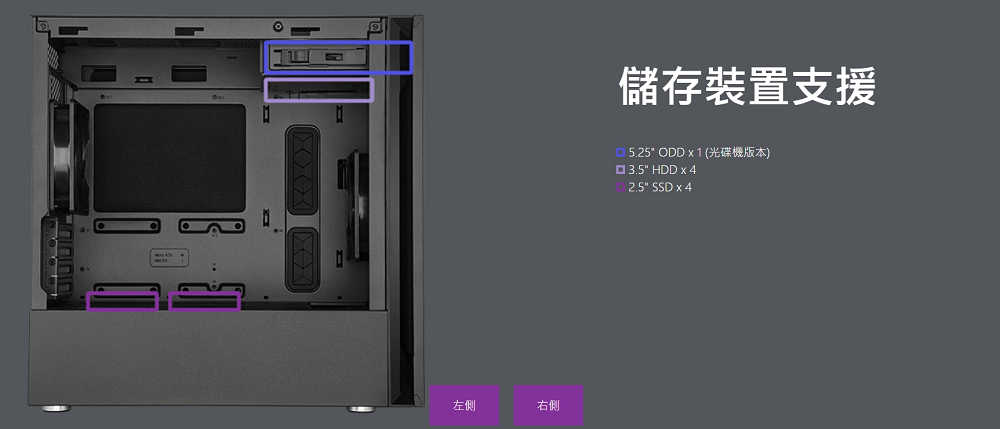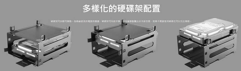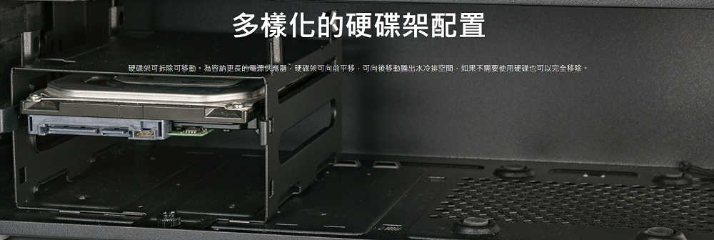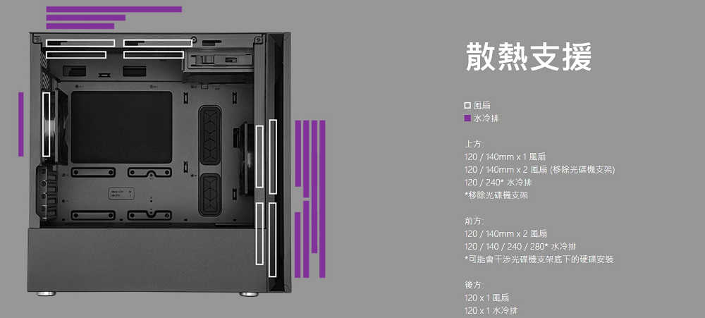 水冷支援度 - 前方:120 / 140 / 240 / 280mm(移除或重新安裝光碟機支架可固定 280mm 水冷排,可能會影響光碟機支架下方的硬碟安裝)