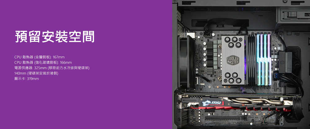 預留安裝空間 - 電源供應器:325mm (w/o front radiator & HDD cage) / 140mm (HDD cage in backmost position)