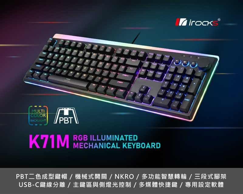 iRocks 艾芮克 K71M 黑 RGB 背光機械式鍵盤 青軸