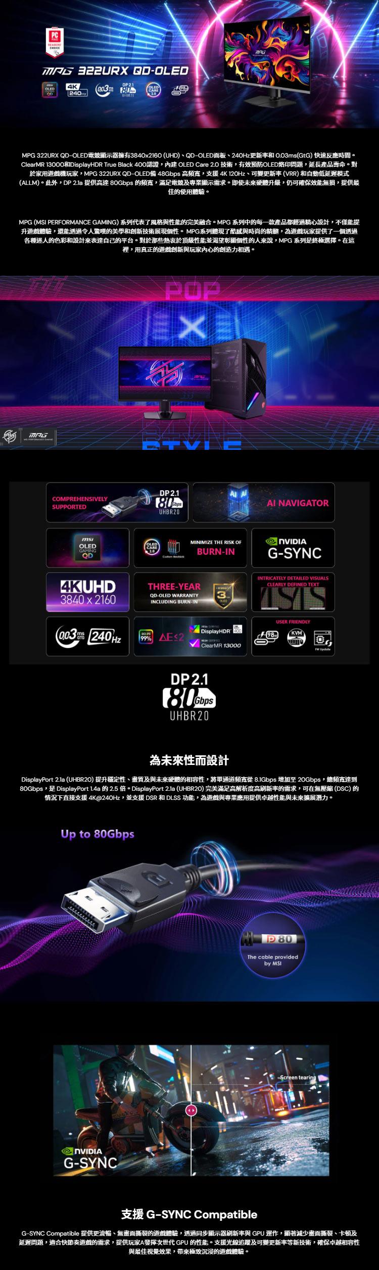 ● DP 2.1a 提供高達 80Gbps 的頻寬,滿足電競及專業顯示需求