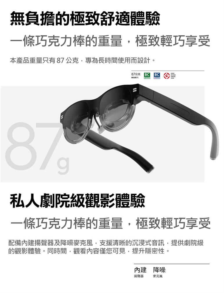 重量僅有 87 公克,且支援內建揚聲器、降噪麥克風及高透明度,保障您的安全。
