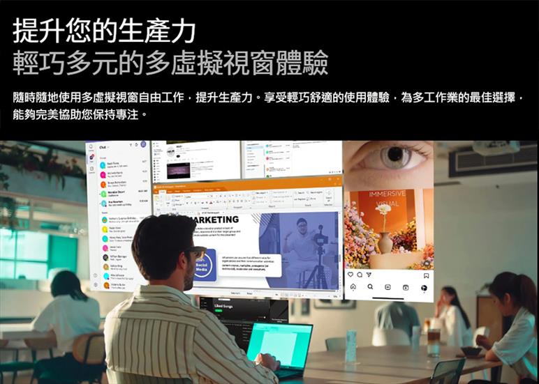 結合多功能及輕盈設計,相容於Type-C 筆記型電腦,支援隨時隨地使用多虛擬視窗工作。