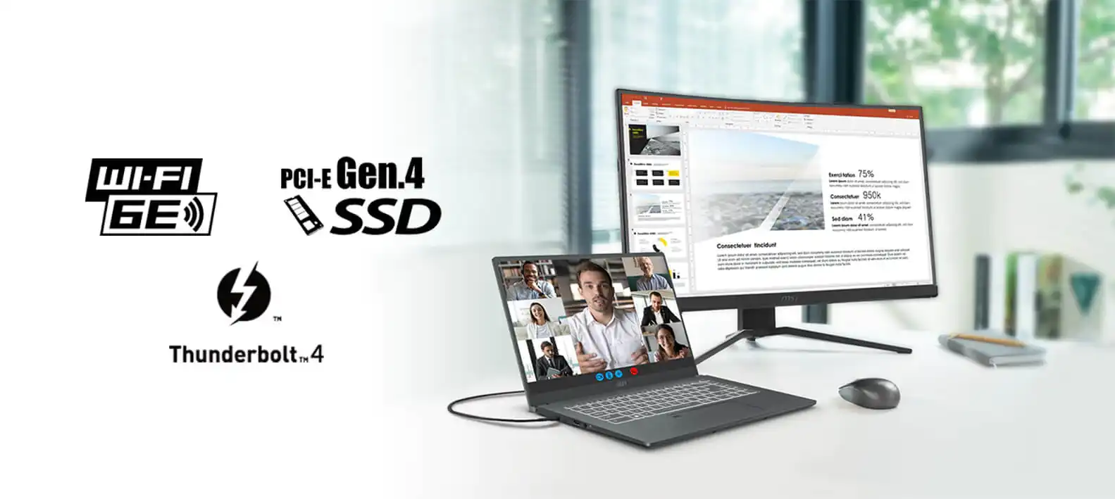 Prestige系列筆電提供完整的I/O連接埠,包括高速傳輸的MicroSD讀卡槽,以及具備多工連接性能的Thunderbolt™ 4 。