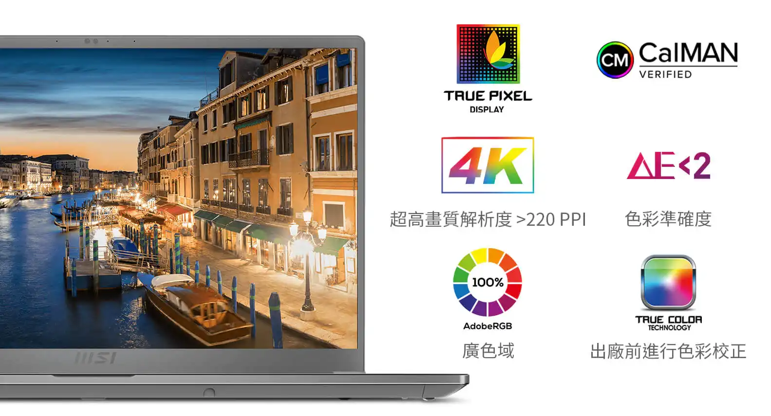 MSI獨家True Pixel顯示技術包括4K UHD超高畫質解析度的面板,透過獨家True Color 校正技術調校出更精準的色彩,支援100% AdobeRGB廣色域提供更完整範圍顏色呈現,以Delta E色彩精準度而言,已達到Delta E<2的極度準確數值。同時,True Pixel技術也經過CalMAN專業色彩認證,提供最準確且真實的視覺呈現。