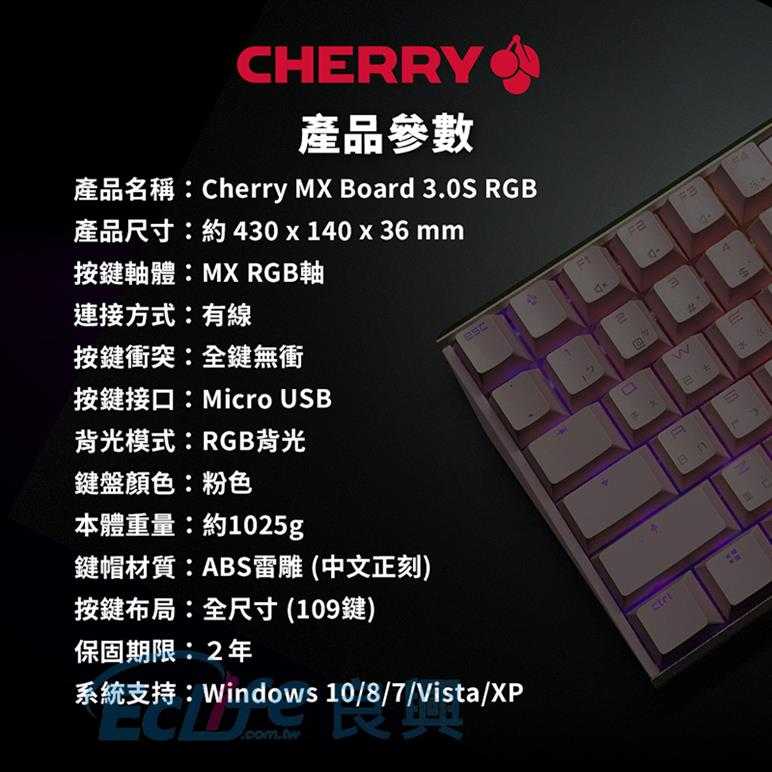 搭配109鍵二色成形雷雕鍵帽體驗Cherry原始細膩手感