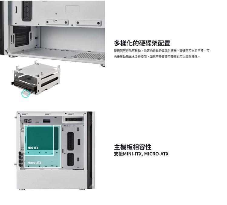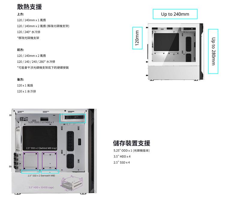 水冷支援 - 前方:120mm, 140mm, 240mm, 280mm (移除或重新安裝光碟機架以安裝 280mm 水冷排, 也許會干涉安裝於光碟機架下方的硬碟裝置)