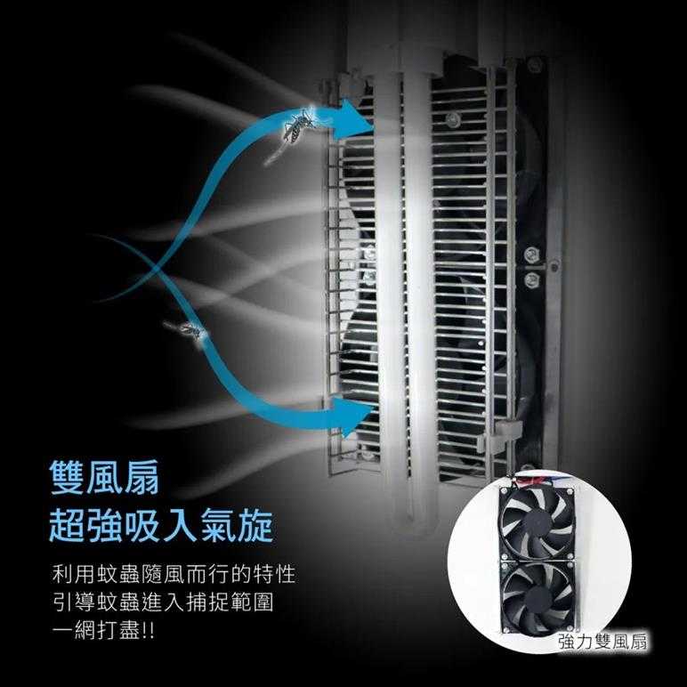 利用蚊蟲隨風而行的特性,加上雙風扇超強吸入氣旋,引導蚊蟲進入捕捉範圍,一網打盡