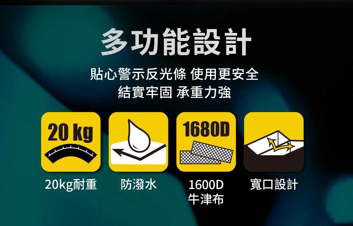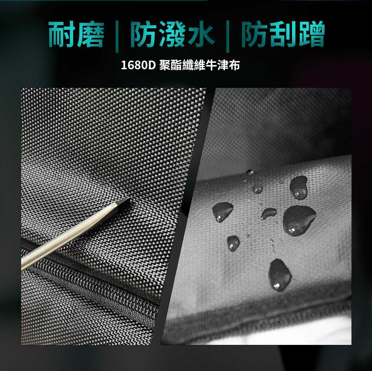 ‧ 1680D牛津布,PVC底層,具防潑水效能。