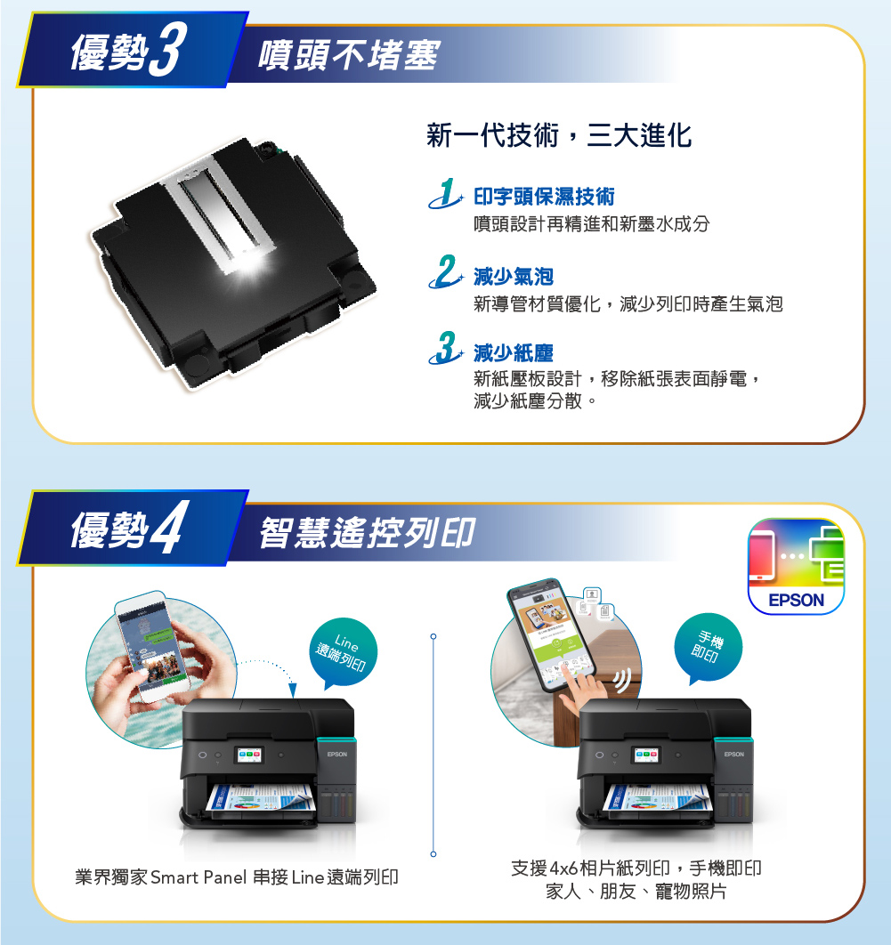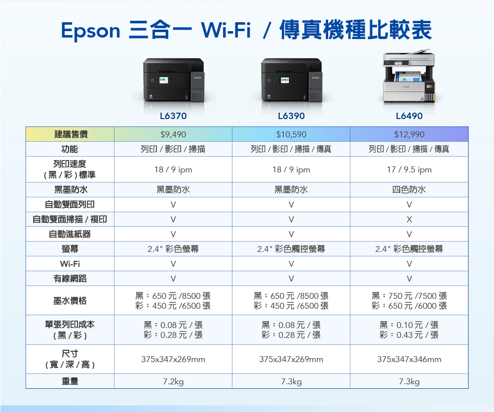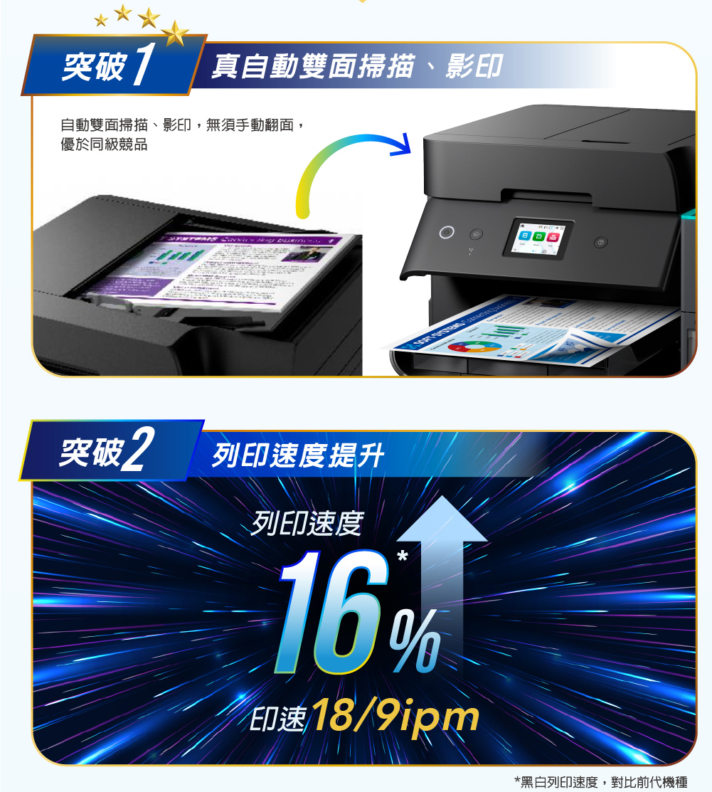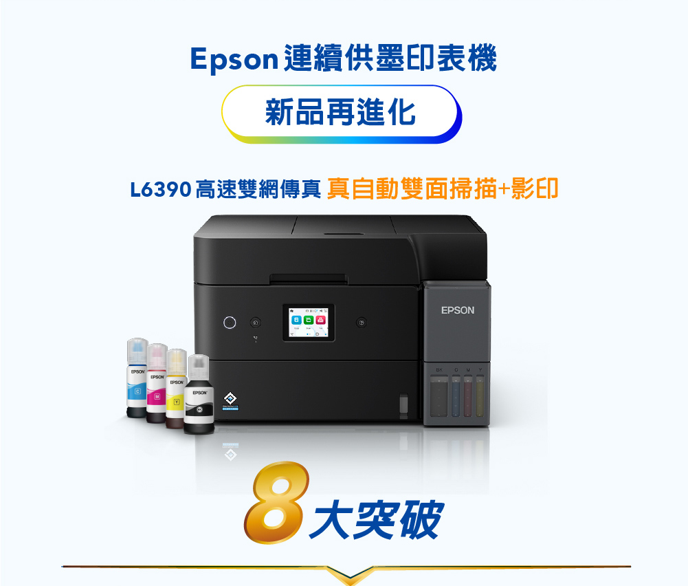 .特色優勢:自動雙面掃描影印/自動雙面列印/A4滿版列印/同級最小寬幅/防呆導墨墨瓶/行動列印透過LINE列印/ Wi-Fi Direct支援最多8台裝置連線/搭載壓電式耐久型噴頭