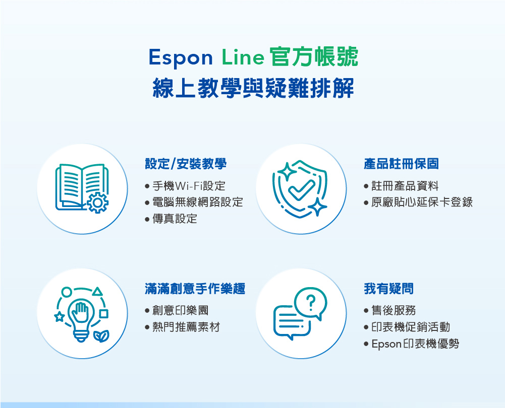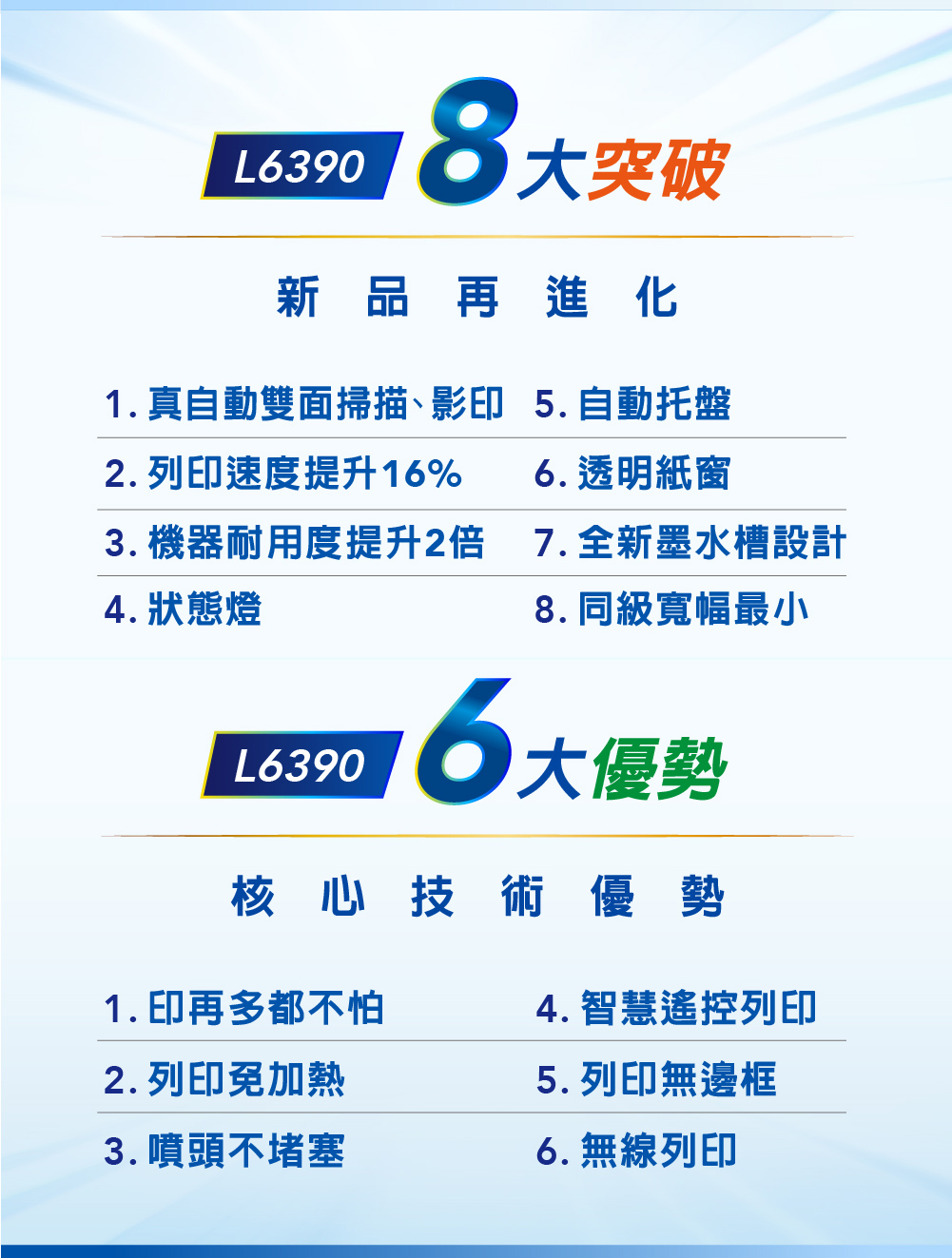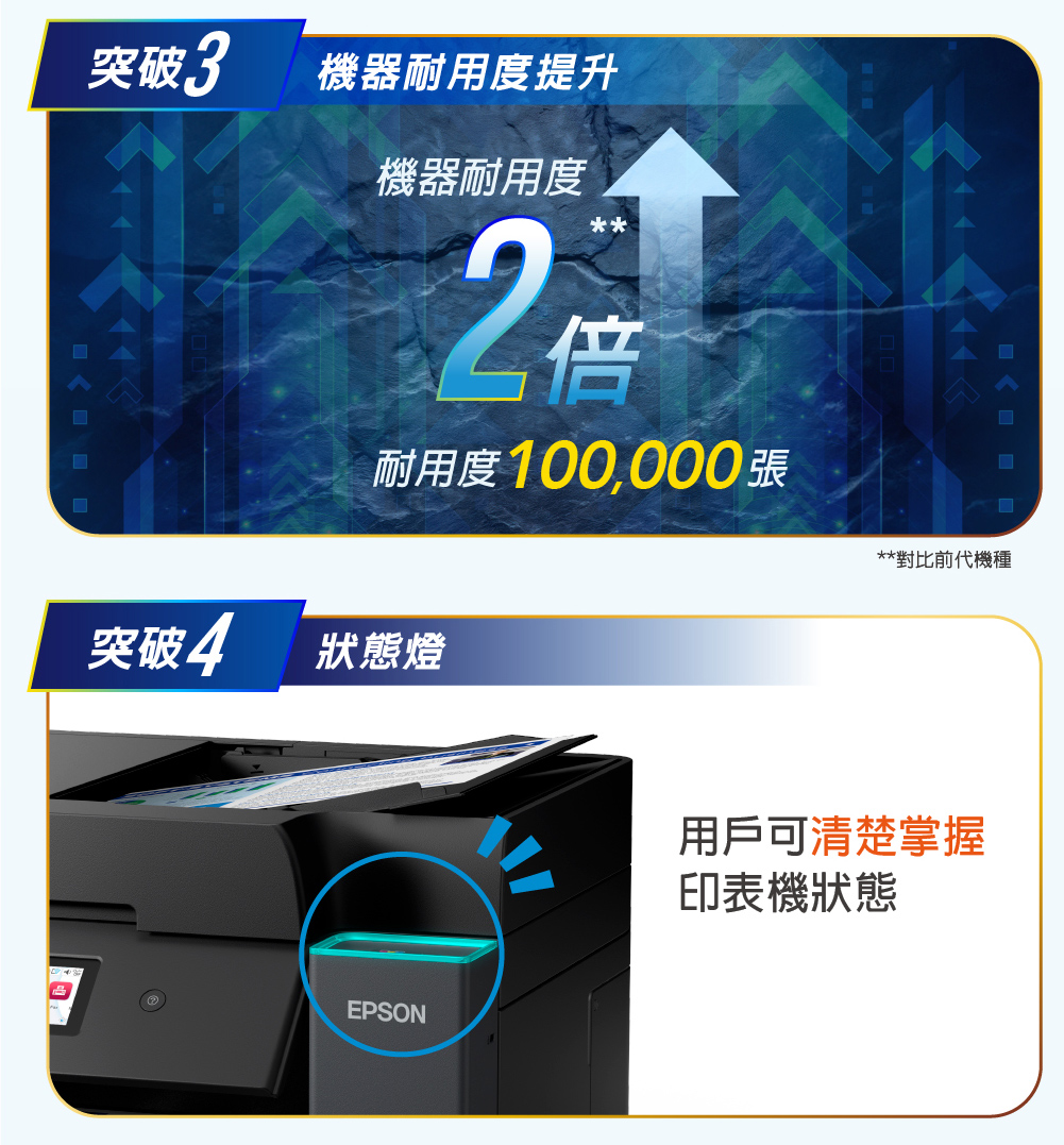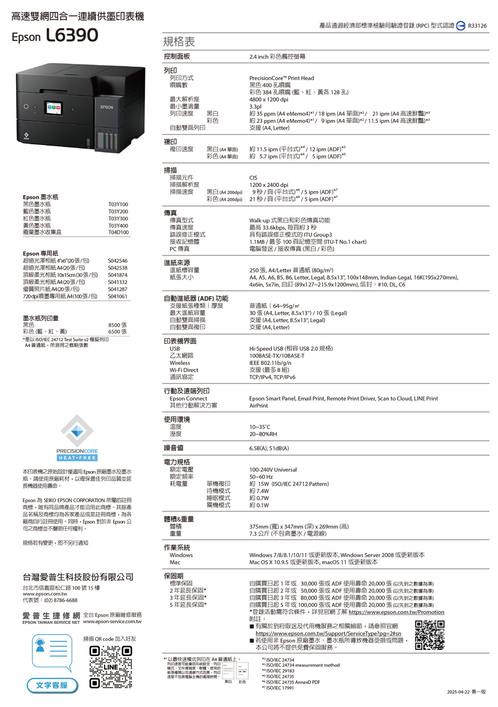 .特色優勢:自動雙面掃描影印/自動雙面列印/A4滿版列印/同級最小寬幅/防呆導墨墨瓶/行動列印透過LINE列印/ Wi-Fi Direct支援最多8台裝置連線/搭載壓電式耐久型噴頭