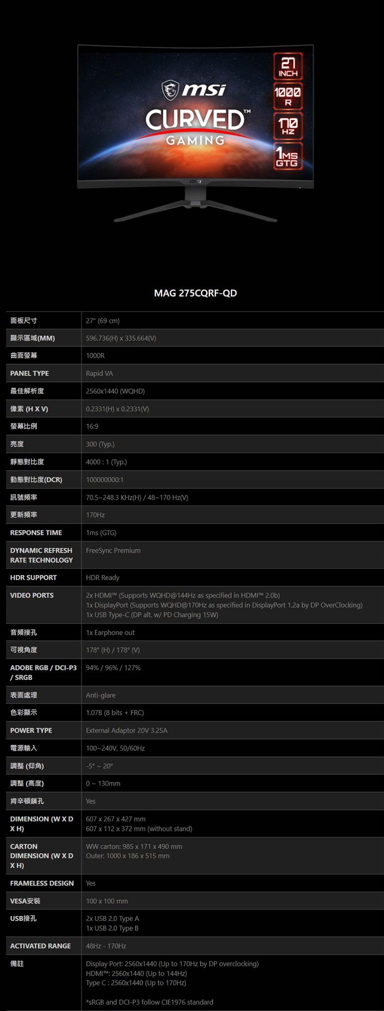● 面板尺寸:27型 Rapid VA面板 1000R