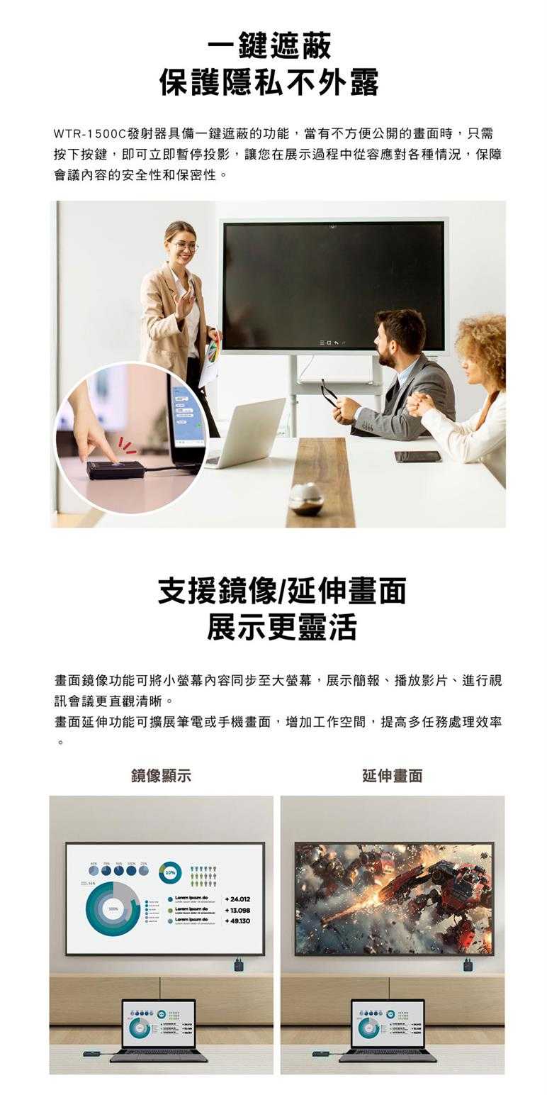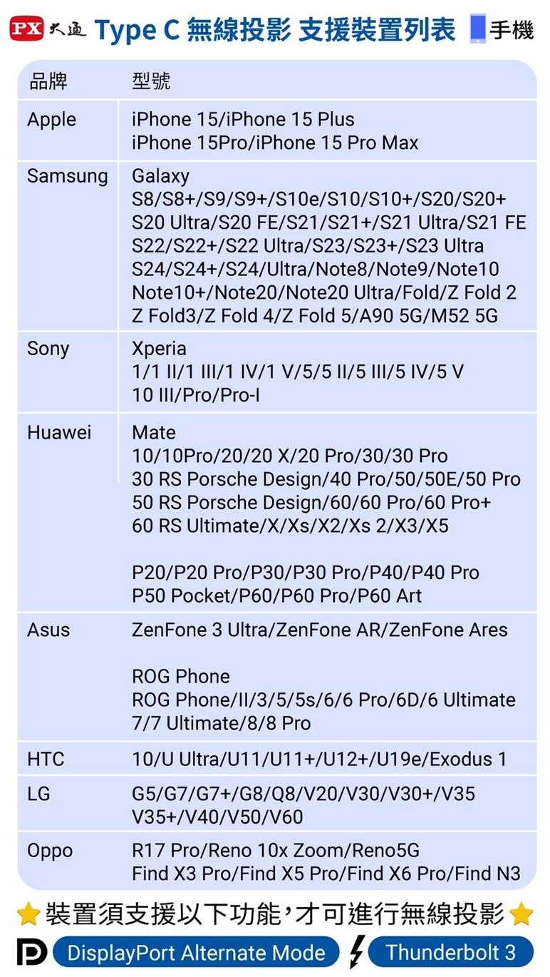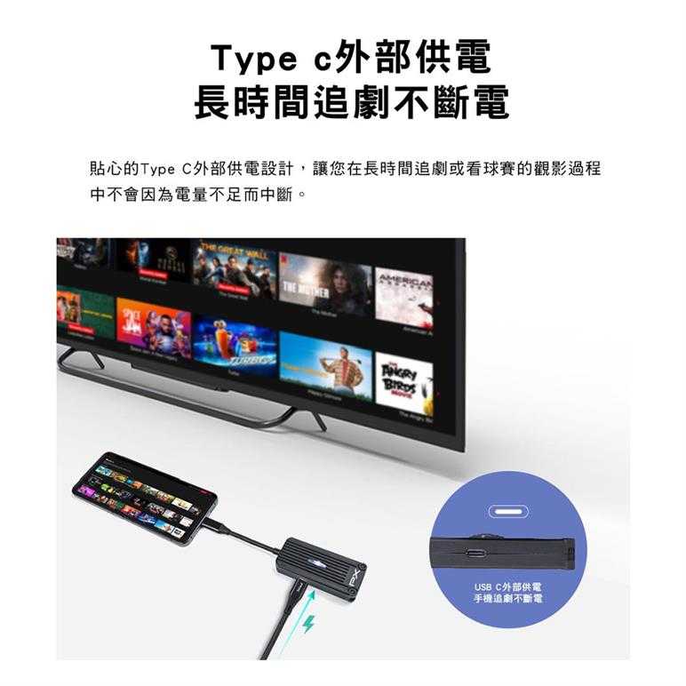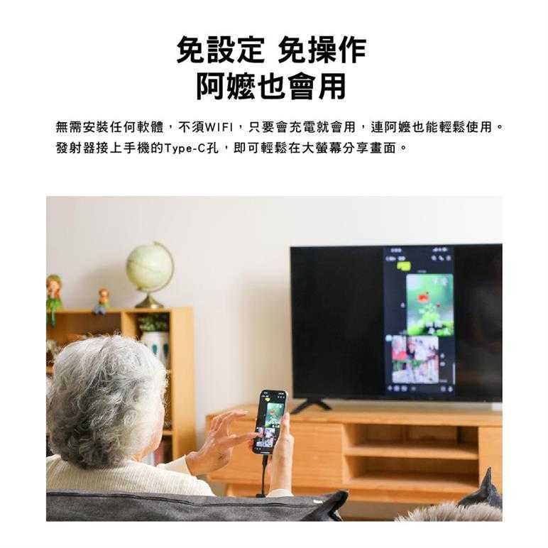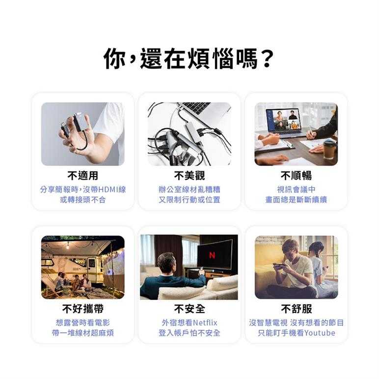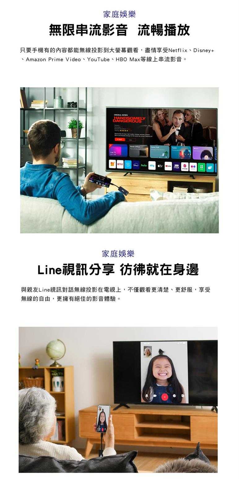 一鍵暫停/投影畫面、免軟體免設定、無限線上影音、USB-C影音+供電