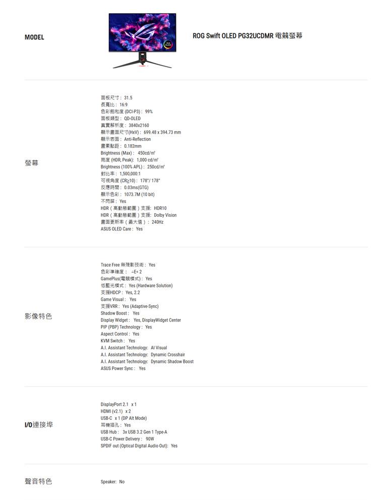 ASUS華碩 32型 ROG Swift OLED PG32UCDMR 電競螢幕 {{specImage.SkuName}}