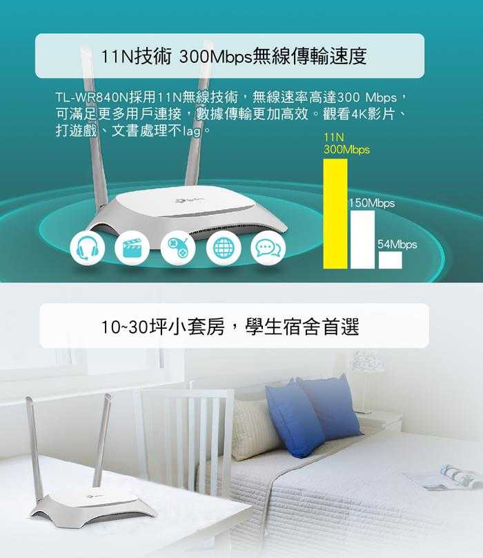 TP-Link TL-WR840N 相容於IEEE 802.11b/g/n標準,使用者能夠體驗高達300Mbps的無線速度,滿足一般家庭網路網路觀看高畫質串流影音、遊玩線上遊戲和傳輸大檔案的需求。