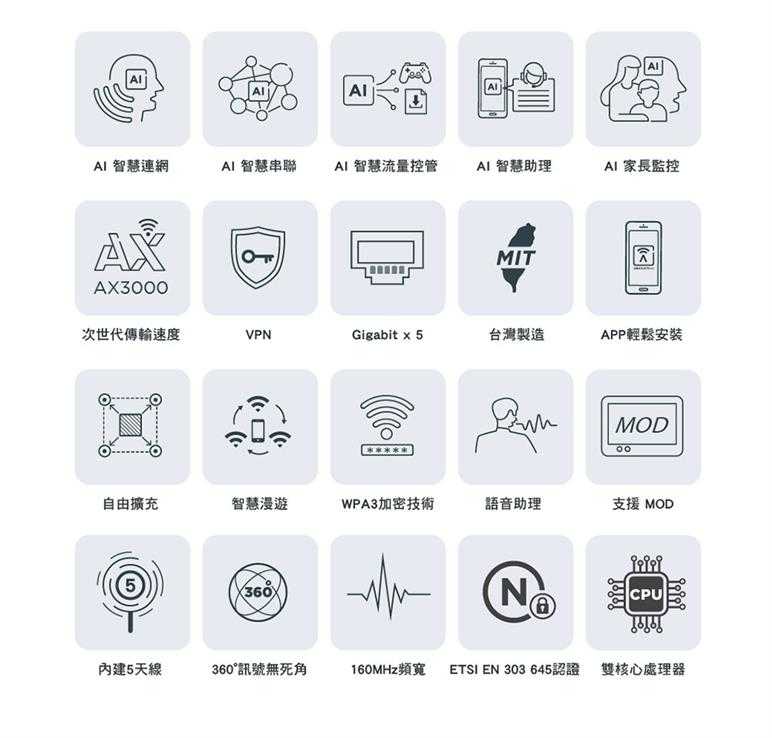 ● 3年保固/Wi-Fi 6 網速 AX3000、VPN Server