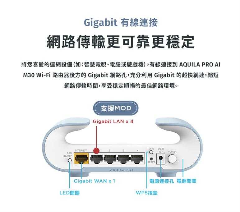 ● 4 個Gigabit LAN及 1 個Gigabit WAN、MOD/IPTV