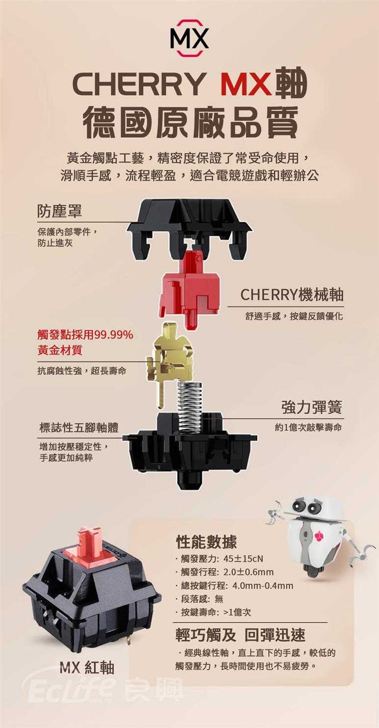 高耐久性:高品質的打磨鍵帽和MX2A機械軸體,保證長時間使用不磨損,按鍵壽命超過1億次。