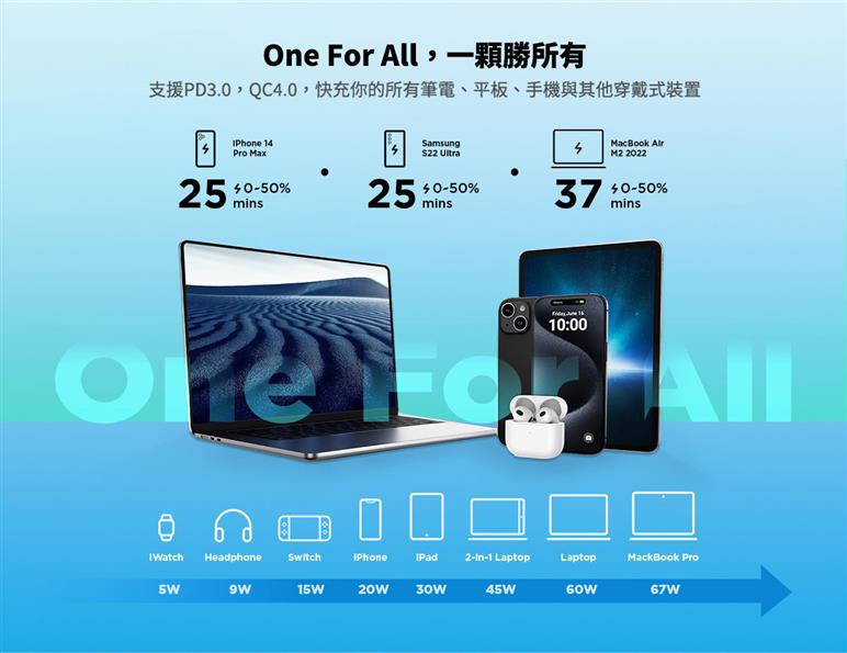 - 67瓦雙孔快充|25分鐘內即可為 iphone 14 Pro 充滿50%電力
