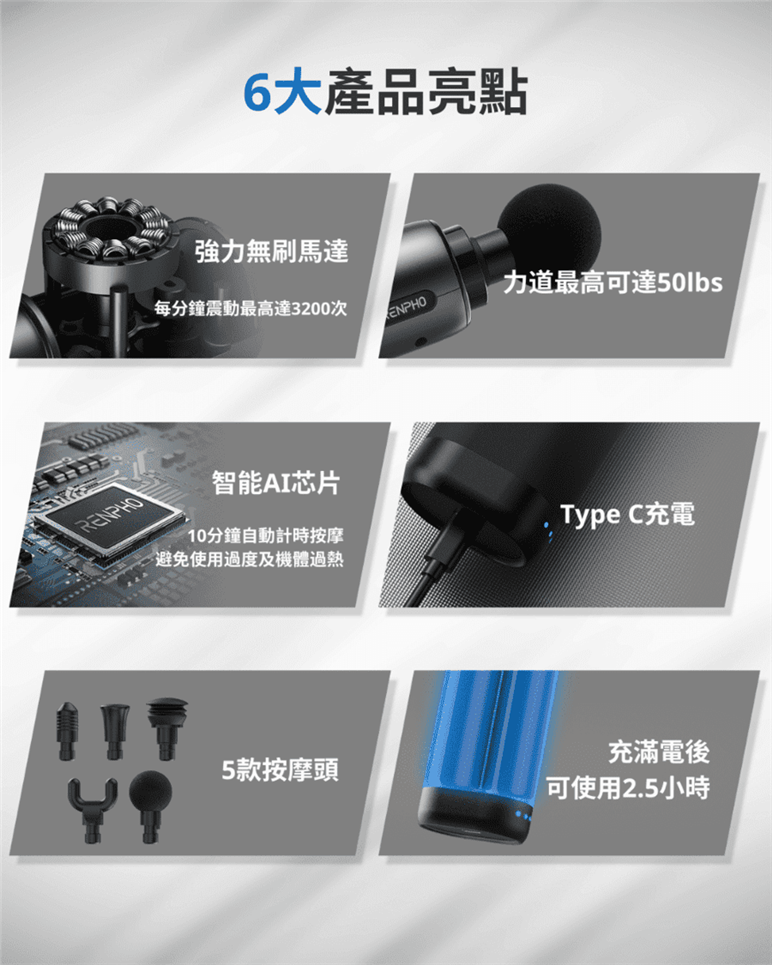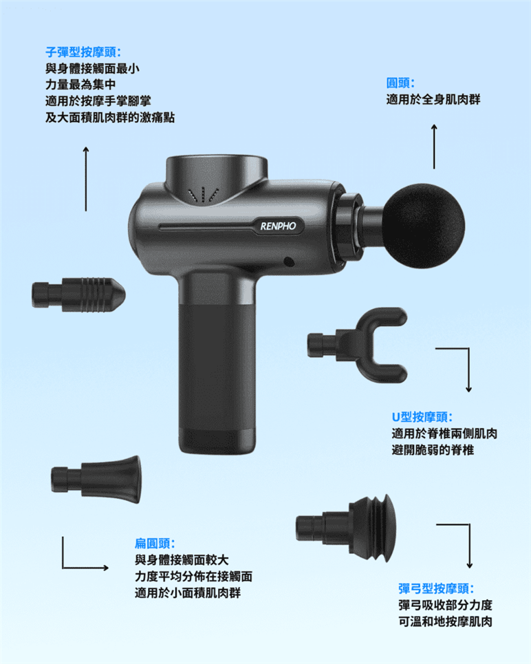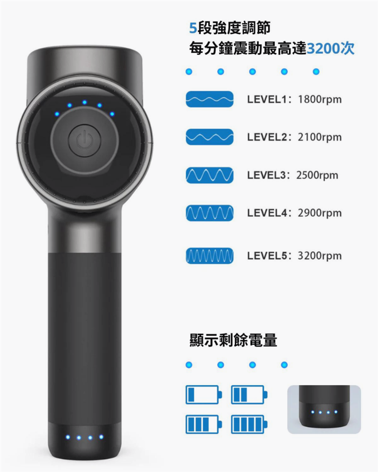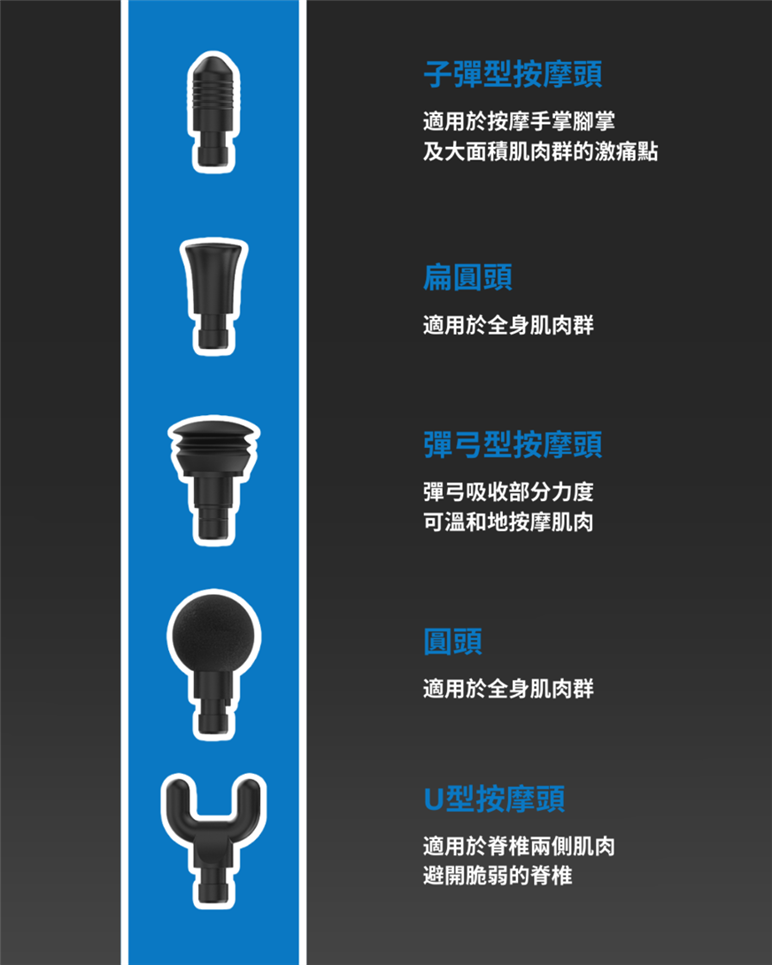 ● 5 種速度, 5種不同形狀按摩頭可供選擇。