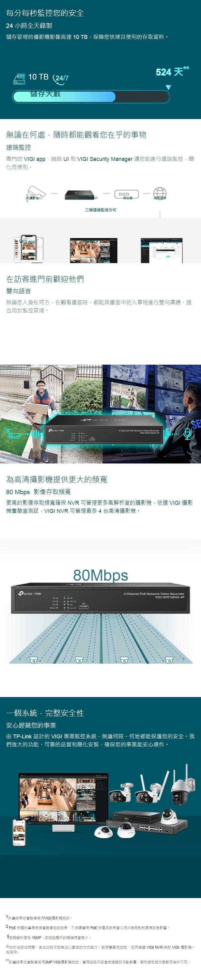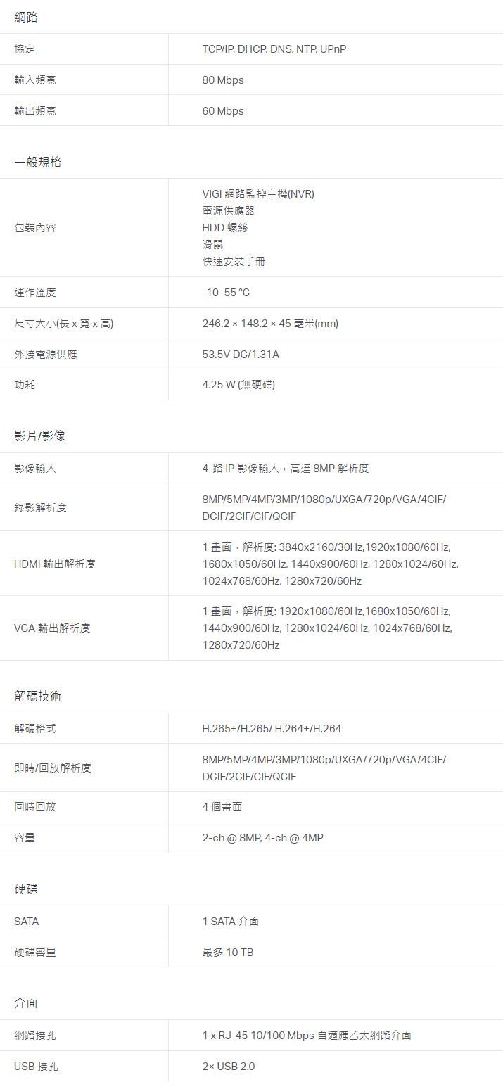 - 80 Mbps 影像存取頻寬: 高影像存取頻寬確保您的 NVR 使用高解析度管理更多攝影機。根據實驗室測試使用 VIGI 攝影機搭配 VIGI NVR,可管理最多四台 4MP 攝影機。