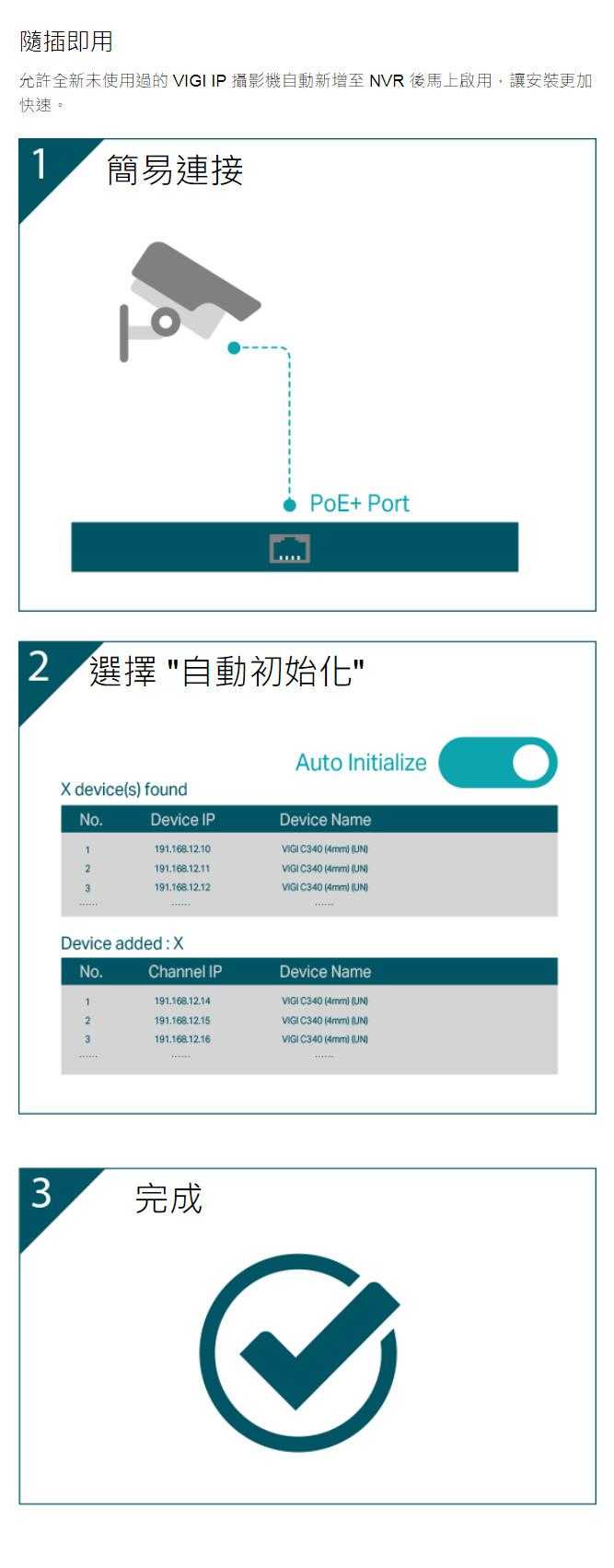 - 隨插即用: 允許新拆封尚未使用的 VIGI 攝影機自動新增至 NVR,讓您接線即使用,體驗前所未有的快速安裝。