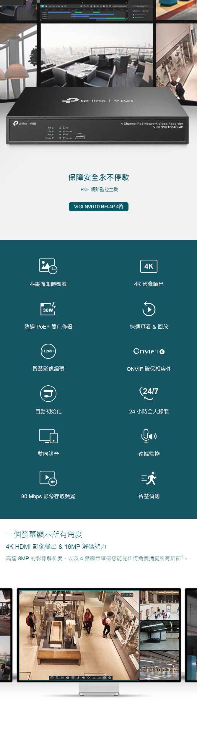- 4K HDMI 影像輸出 & 16MP 解碼能力: 提供高達 8MP 的更清晰影像解析度以及 4 路畫面顯示,確保您可以從任何角度捕捉所有細節†。