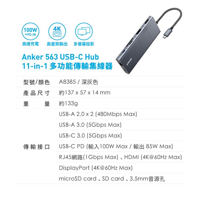ANKER A8385 563 USB-C Hub 11-in-1高效能傳輸集線器原價1990(省100)