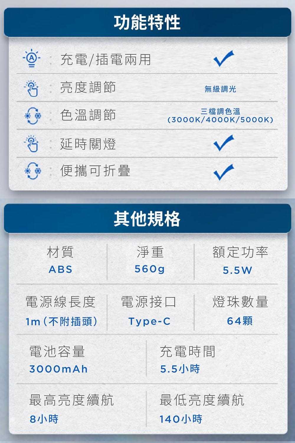 內建鋰電池,停電也可用,超高續航電力(最高亮8小時,最低亮140小時)