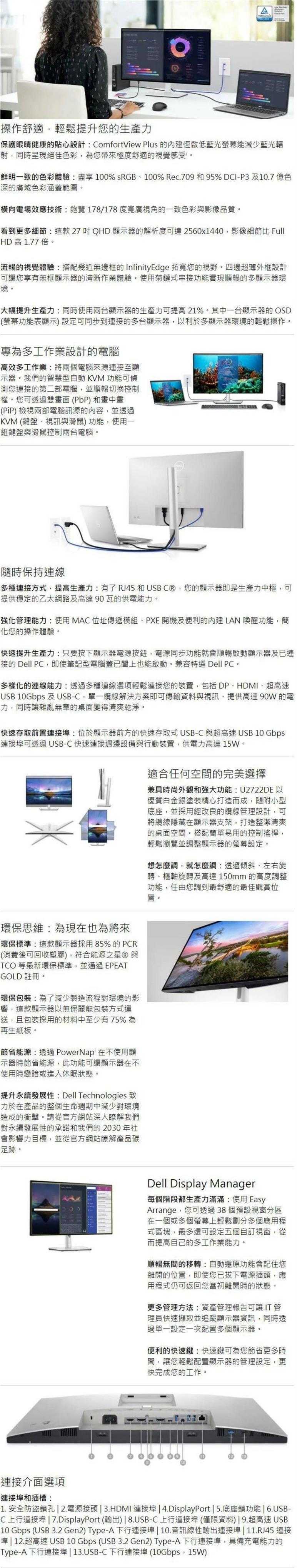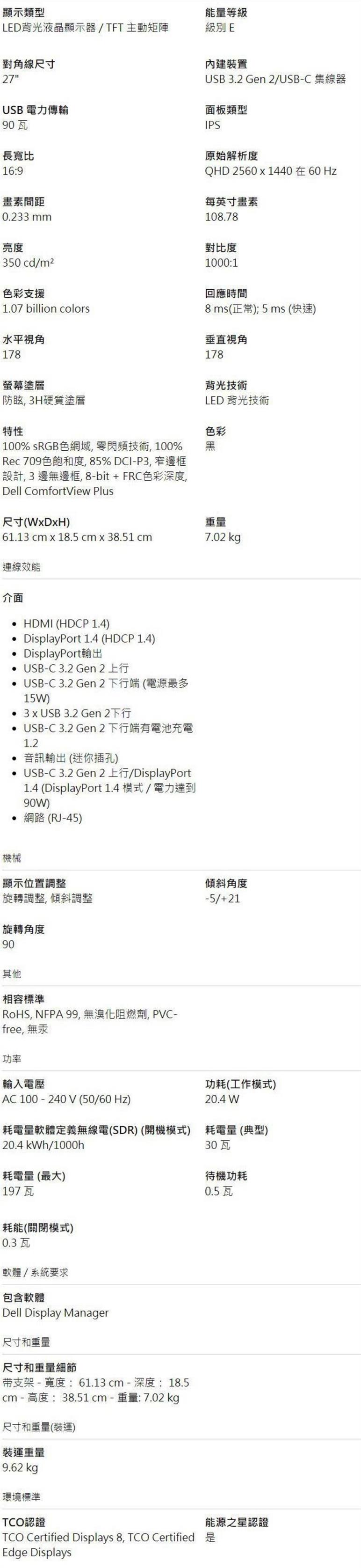 這款 27 吋 QHD 顯示器具備優異的連線能力、明亮的色彩涵蓋範圍,包括 DCI-P3、ComfortView Plus (內建恆啟低藍光螢幕) 和 USB-C 埠,並搭配高達 90W 的電源供應器及乙太網路連線能力,讓您的工作更上一層樓。