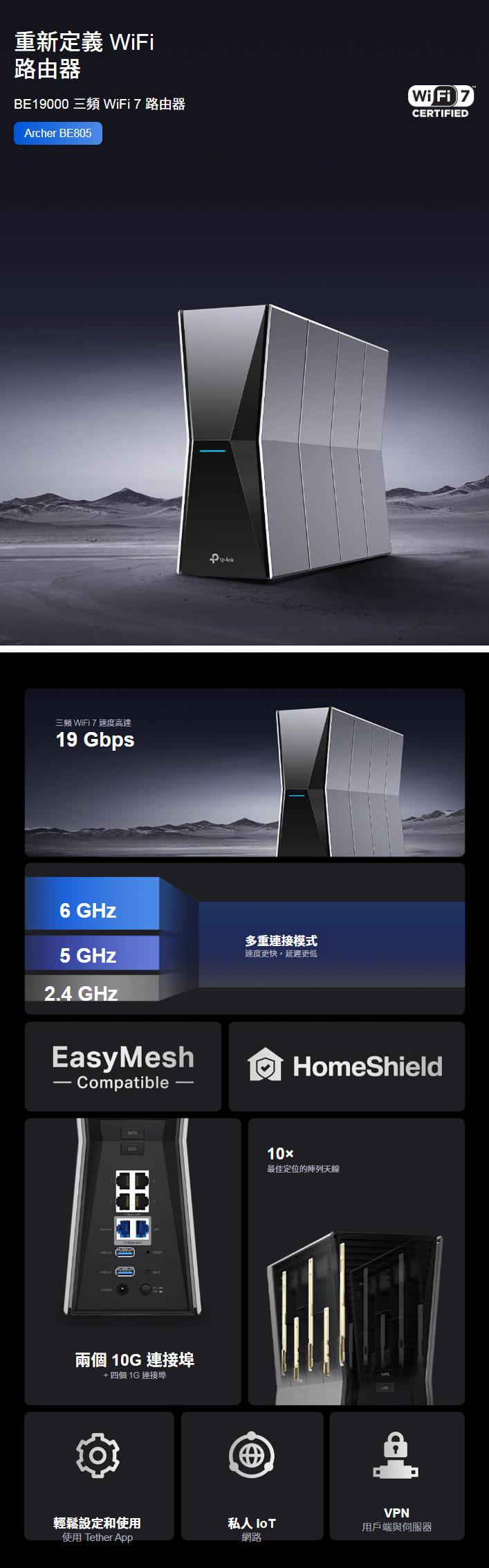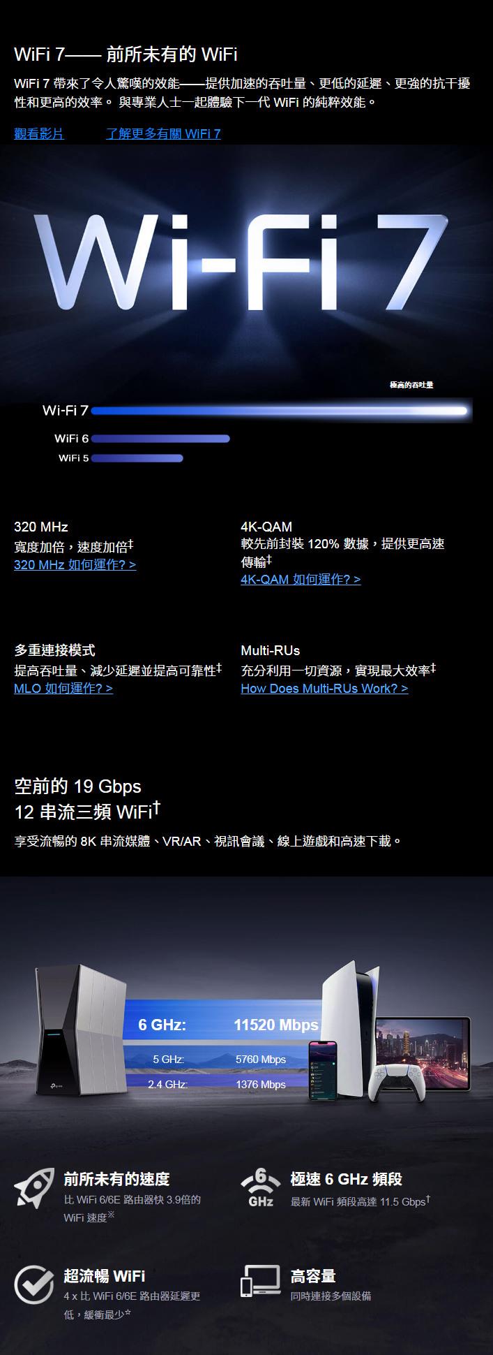 - 閃電般19 Gbps三頻WiFi 7:讓您的設備全速運作。 享受流暢的 4K/8K 流媒體、沉浸式 AR/VR 遊戲以及閃電般的下載速度†‡