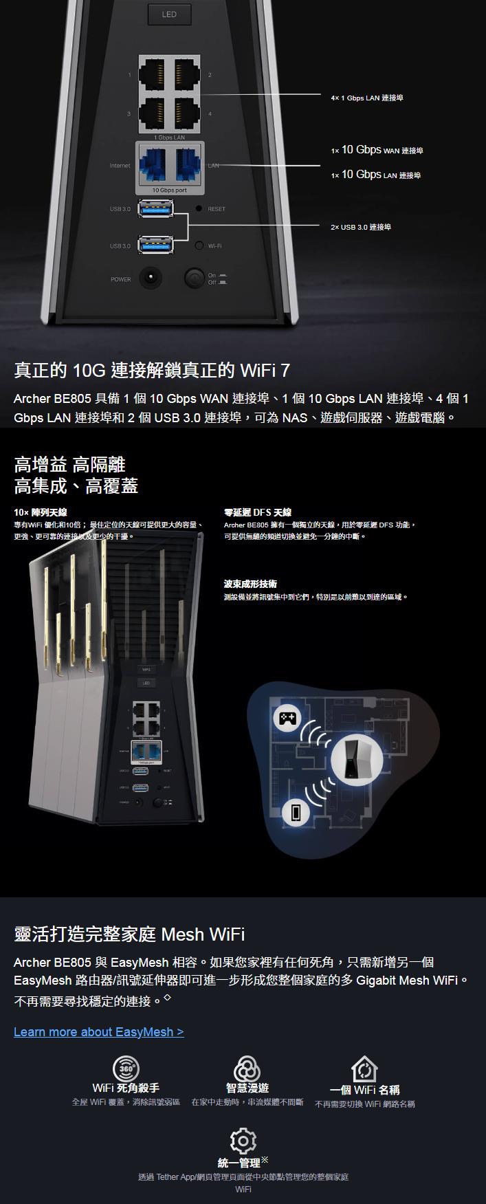 - 最大化覆蓋範圍:WiFi優化和10根最佳定位天線以及波束成形可提供更大的容量與低干擾