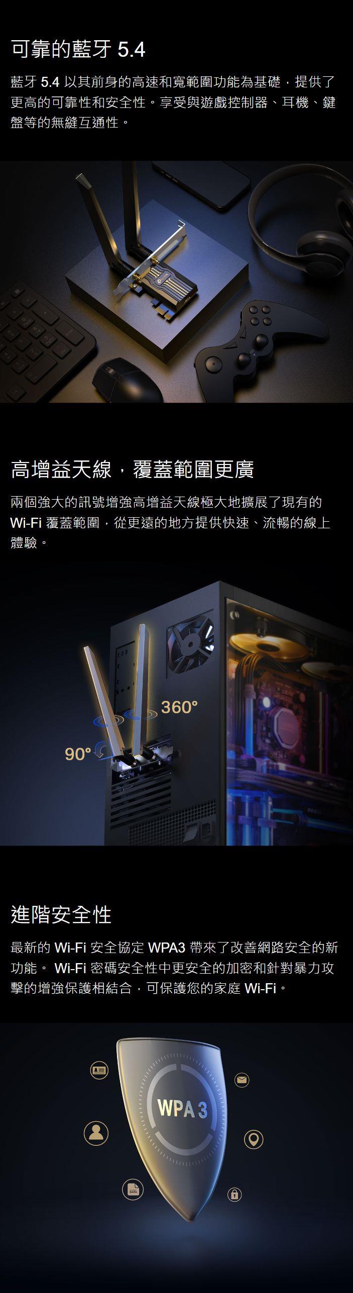 - 頂尖 WPA3 — 使用最新的 WPA3 安全協定保護您的網路,確保您透過無線網卡傳輸的資訊免受駭客攻擊