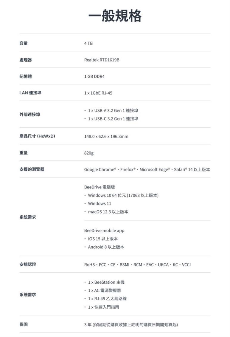 Synology 群暉科技 BeeStation 4TB 個人雲端儲存