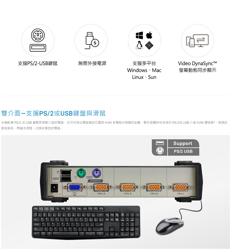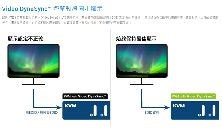 ● 螢幕動態同步顯示(Video DynaSync?)技術–ATEN獨家技術能避免開機會產生的螢幕顯示問題,並在切換連接埠時保持最佳螢幕顯示解析度