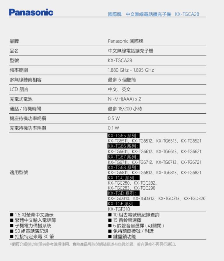 KX-TGC 系列:KX-TGC280、KX-TGC282、KX-TGC283、KX-TGC290