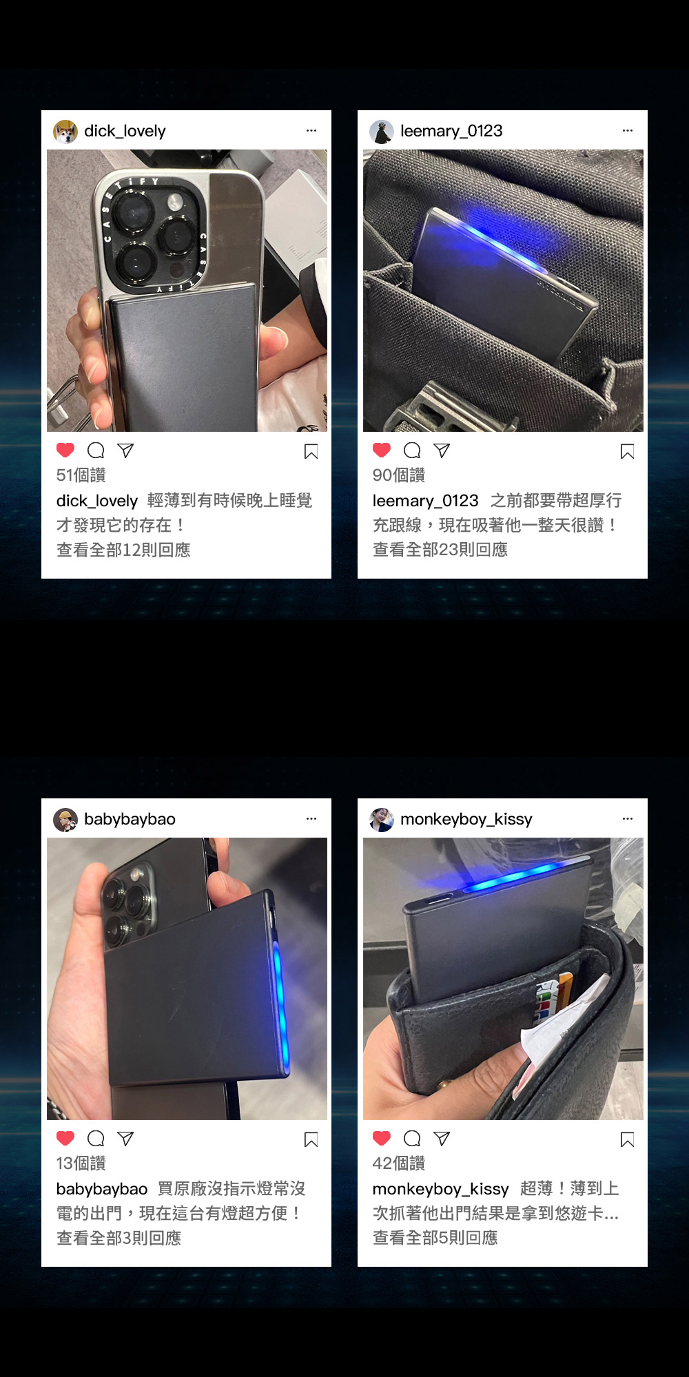 A1:電源指示燈顯示電量共四段為 25% 50% 75% 100%,如電量低於10%將無法替裝置充電,需先替無線充電卡蓄電。